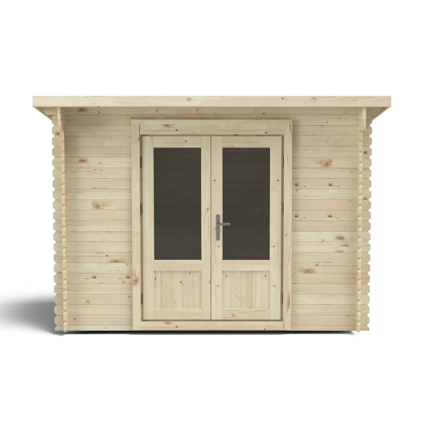 The Harwood is Forest’s smallest log cabin, making it perfect if space and/or budget are limited. Despite a compact footprint of 2.2m x 3.2m (depth x width) it offers 4.8 square metres (51 square feet) of internal floor space which is plenty for a small home office, hobby room or garden room. Its pent roof design is unobtrusive, stylish and gives it a modern look.