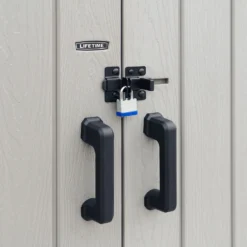 It is large enough for residential garbage containers, lawn mowers, and bikes, but also equipped with shelving and removable wall hooks for smaller items such hand tools, power cords, shovels, and rakes. The double-hinged doors fully open making it convenient to move items in and out of the shed. The slider lock and deadbolts (lock not included) allow you to keep your belongings safe and secure.