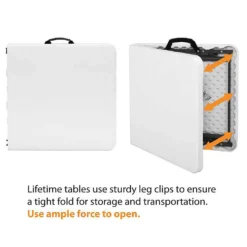 - Table folds for in half for easy storage – Simple push-pin mechanism for setup or takedown