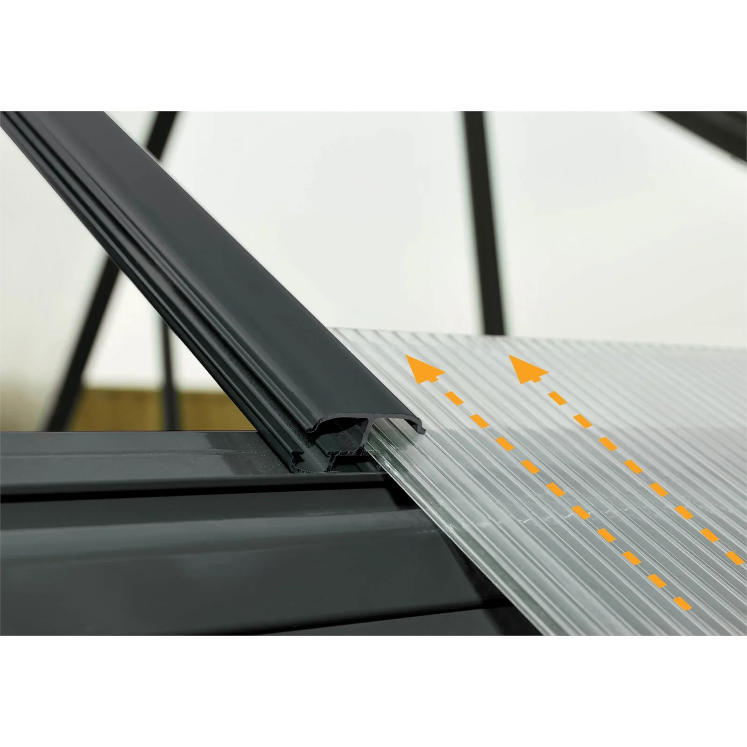 Extend your summer days and enjoy the warmth of the first sun rays. The gorgeous T-shaped spacious cathedral design of the Victory Orangery Chalet greenhouse makes it elegant enough for leisure activities during spring and autumn and roomy enough for all of your gardening projects year-round. Twin-wall roof panels protect from strong sunlight exposure and crystal-clear panel walls provide over 90% light transmission.