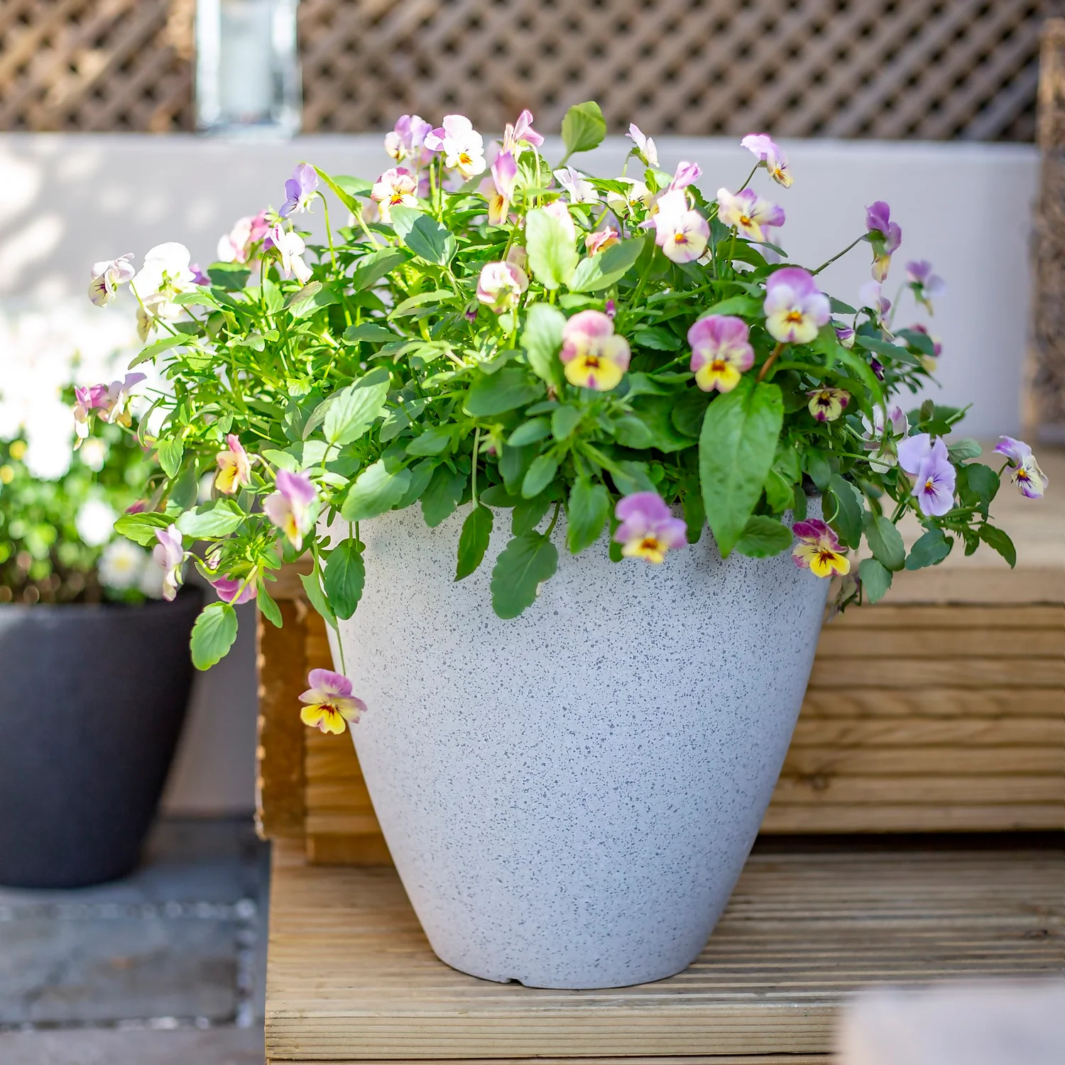 Made from recycled plastic, these Pinto pots are moulded and finished to look like terrazzo. When planted up its almost impossible to tell these lightweight pots from traditional materials.